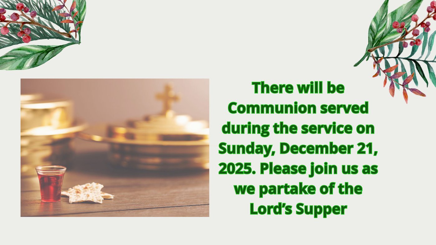 Please join us on Sunday, December 21 as we celebrate the Lord's supper. Let us examine ourselves and come together in unity and harmony to partake of the sacraments of the what represent His Body and His Blood, broken and shed for us. Let us come together and offer praise and thanksgiving as we learn more, how to appreciate what all He did for us during His life, death, and resurrection!