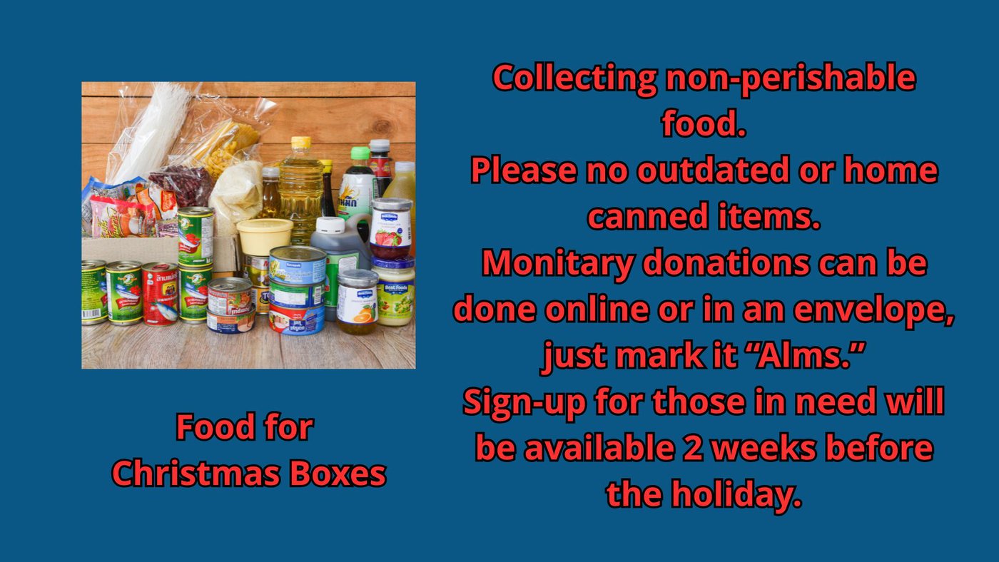 The church will be collecting NON perishable food items for Christmas Boxes. A collection box has been placed outside the church secretary’s office. A list of recommended items is posted on the front of the box. Please no outdated or dented cans, or home canned items. Monetary donations can be given either online or on a tithes envelope, write “Alms” on the memo. A sign-up sheet for those that have need of a Thanksgiving or Christmas box will be available 2 weeks before the holiday.