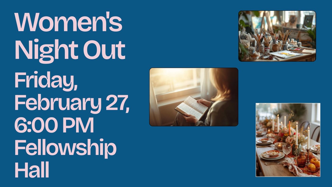 Hey Ladies, our next night out is Friday, February 27 in the Fellowship Hall. We are asking everyone to bring appetizers to share. If enough are brought, then those who haven't eaten before will have plenty food to choose from. We have planned a simple craft for all to enjoy and then we will have a Bible activity for all of to do. We look forward to seeing each and everyone of you there.